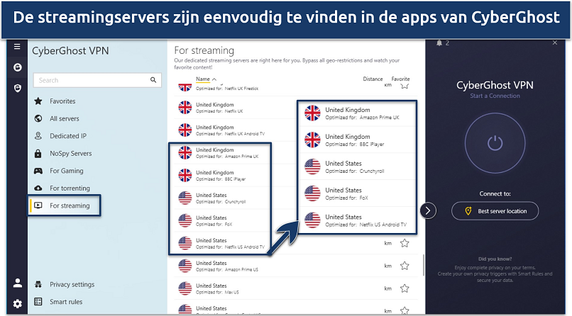 CyberGhost is een van mijn favoriete VPN’s voor streamen. De provider biedt gespecialiseerde servers voor streamen, die zijn ontworpen voor toegang tot een reeks internationale platforms. Elke server is gelabeld naar het platform waar de VPN het beste mee werkt, waardoor het gemakkelijk is om de gewenste server te vinden. De servers zijn ook geoptimaliseerd voor soepele streams, zodat je programma’s en films in HD kunt kijken zonder onderbrekingen.
