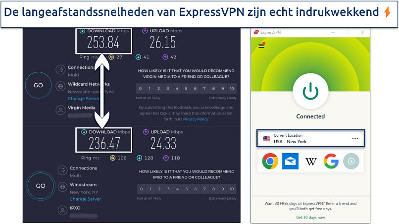 ExpressVPN is de beste allround VPN die ons wereldwijde team van VPN-experts heeft getest. De VPN biedt de hoogste snelheden op nabijgelegen en langeafstandsverbindingen en sterke beveiliging. Mijn collega in het VK testte meerdere servers consistent met behulp van het snelheidsgeoptimaliseerde Lightway-protocol. Gemiddeld had dit nauwelijks invloed op de verbindingssnelheden. Lokale snelheden namen met slechts 5% af, terwijl verbindingen met servers op duizenden kilometers afstand slechts een snelheidsverlies van 7% lieten zien.