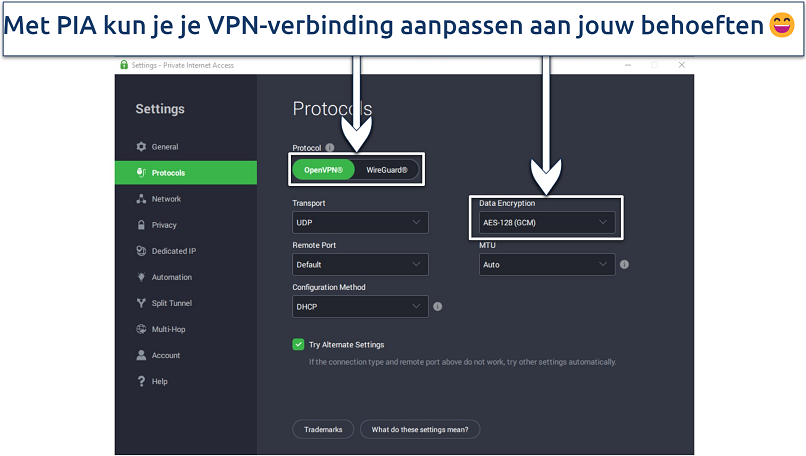 3. Private Internet Access — Aanpasbare app-instellingen waarmee je snelheid en beveiliging in evenwicht kunt brengen