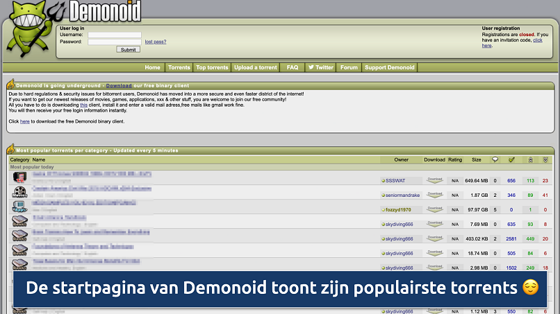 Je kunt niet langer torrent bestanden downloaden zonder een account op Demonoid. De homepage geeft ook aan dat je een aangesloten VPN-client moet installeren om toegang tot de content te krijgen.