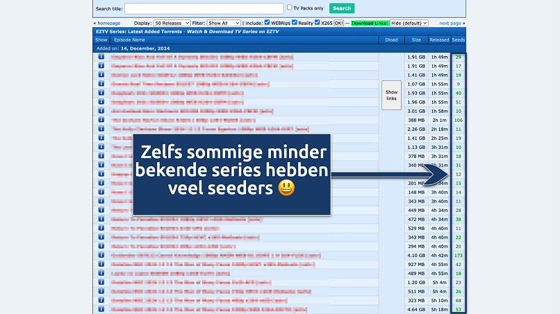 EZTV is gespecialiseerd in tv-shows en trekt elke maand zo'n 20 miljoen bezoekers aan. Hoewel het misschien niet zo'n uitgebreide bibliotheek heeft als enkele van de grotere P2P-sites zoals The Pirate Bay of 1337x, is het een uitstekende keuze als je specifiek op zoek bent naar tv-shows. Bovendien heeft het een uitgebreide collectie van oude shows.