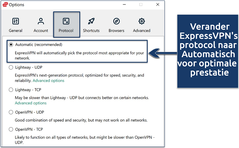 Maar ExpressVPN raadt aan het protocol op Automatic te zetten voor de juiste werking van obfuscatie. Om dit te doen, klik je op Opties > Protocol > Automatisch.